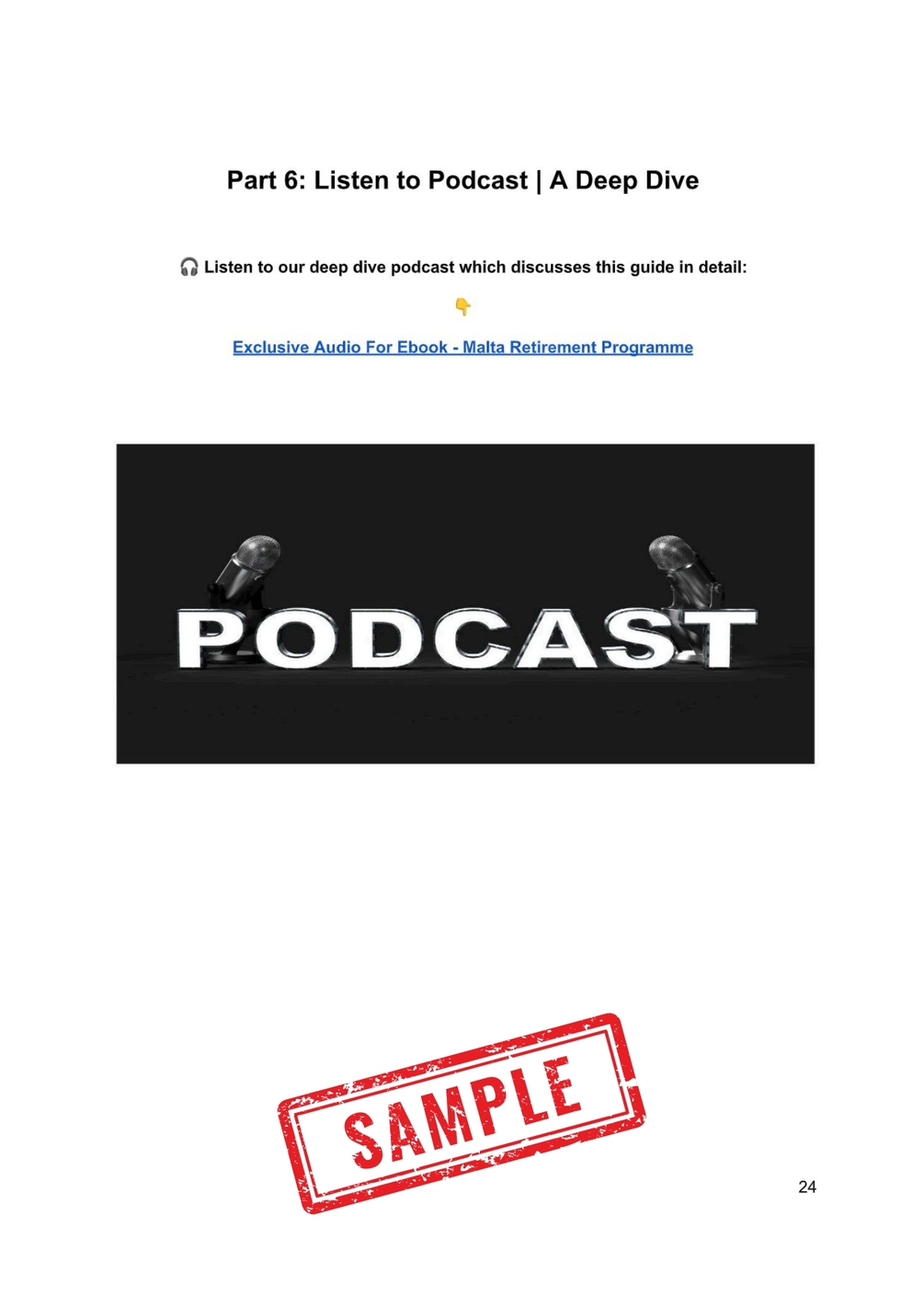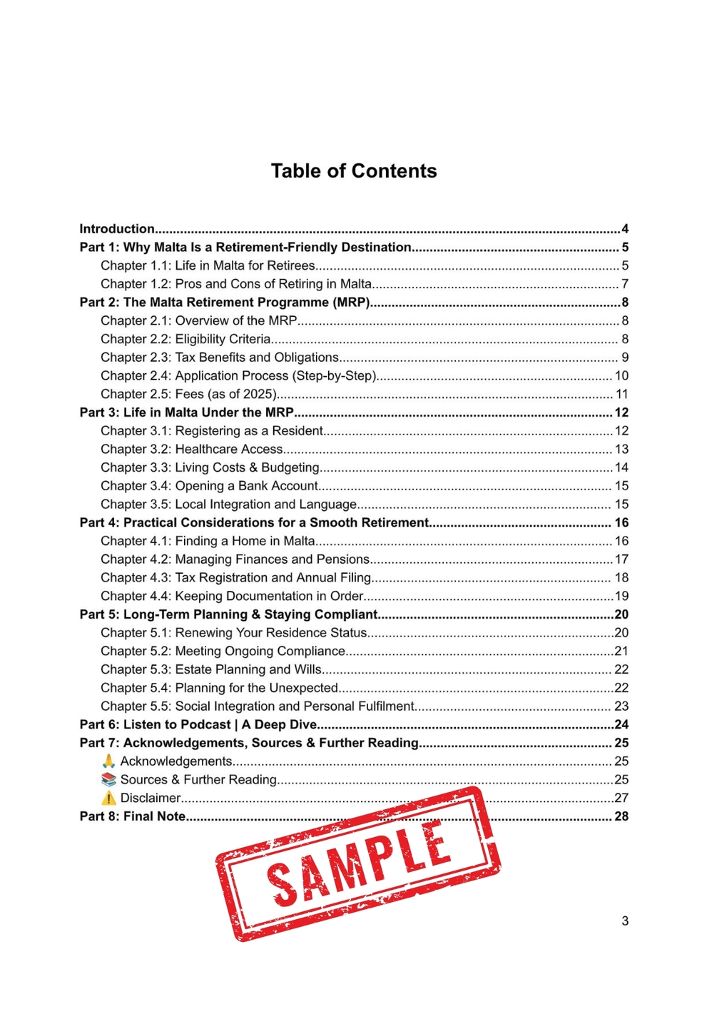 This e-guide contains most of what you need to know in order to turn your dream into reality. If you are looking to retire in Malta, specifically under the Malta Retirement Programme (MRP), this guide can help you better understand the steps involved. With a hyperlinked table of contents, this PDF can also be viewed offline and on any device. All the information you need in your pocket! As a bonus, this guide also contains a link to an exclusive deep-dive podcast to further help your understanding.